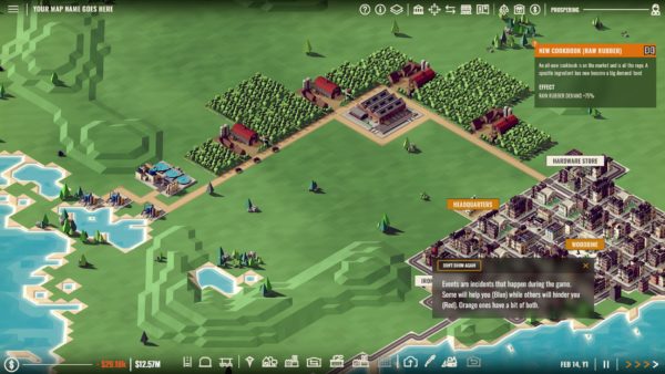 The premise is easy to understand: you’re a new business owner seeking to profit from the old fashioned game of supply and demand. You’ll choose a place to plonk down your headquarters which gives you the rights to build various gathering and production buildings in the region. The town has demands that you can meet, although you’ll want to pick your products carefully as not all of them will put you on the path to wealth. From there you’ll work through a tech tree to build even more elaborate products and infrastructure, allowing you to extract even more profit from your town. Over time you can expand your empire to other regions and you’ll have to set up transport routes between your different areas as there’s likely going to be things one place has that the other needs. As you’d expect this can all get pretty complex and whilst the tutorial does a good job of giving you the basics from there on out it’s up to you figure out how you and your company will profit.
