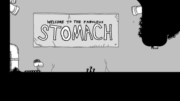 BirdGut’s visuals are all hand drawn in a greyscale colour palette. Honestly the amount of effort that went into putting these visuals together is quite phenomenal, even for a less than 2 hour game. Each of the screens is its own little unique world, filled with all sorts of random detail. The animations are buttery smooth too, something you don’t see often with hand drawn games. This is all then juxtaposed with ludicrousy that this is all supposedly taking place inside a bird’s digestive system, something you’re reminded about in the most weird and unusual ways. It was this weird styling that first attracted me to the game as it’s rare enough for a game to be done this way and rarer still for it to be free.