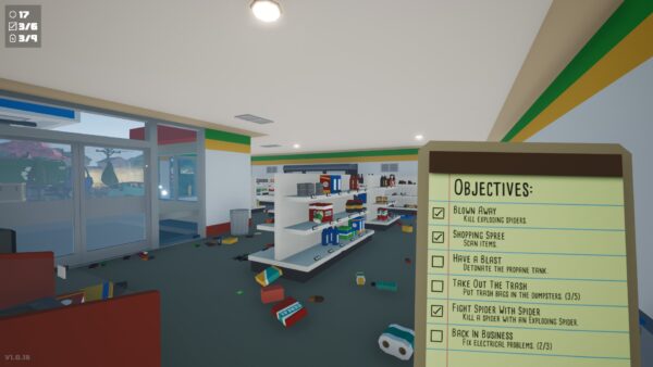 The weapons you get given are honestly, pretty hilarious, although most of them aren’t exactly as useful as you might think. The shotgun seems to have about as much spread as the revolver which means both are rather difficult to use on a fast moving spider skittering along the floor. The molotov cocktails, lighter/hair spray and petrol can are far more effective tools especially considering that it seems spiders like to cluster in hiding spots meaning 1 lit spider gets them all. The explosives are a little bit of fun but the number of physics objects and destructible environments are pretty limited so they don’t produce the usual cacophony of debris that you’d expect.