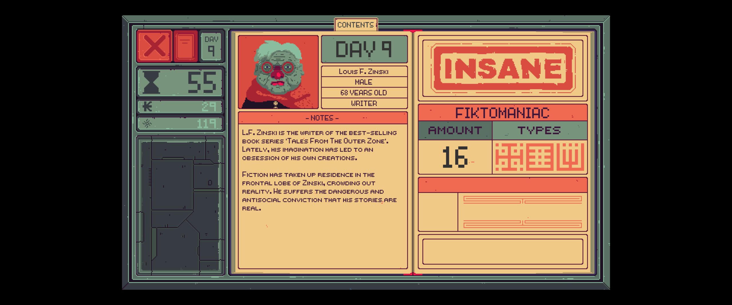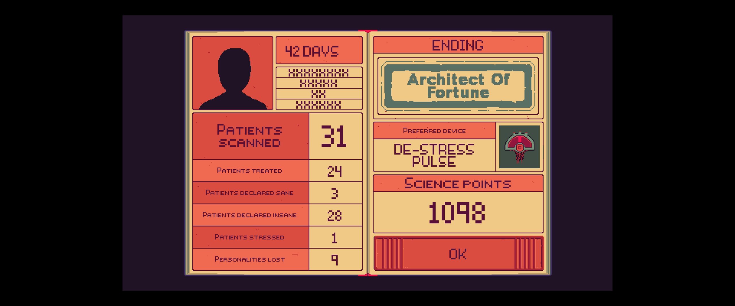 Mind Scanners is a very unique take on the bureaucracy simulator genre, putting you in charge of treating the citizens of The Structure who display personality traits that are out of line with what’s expected of them. This starts out simple enough as the cases are pretty clear and dry, but you’ll quickly end up questioning what the meaning of “insane” really is in this world and whether or not you should be applying treatment to…well anyone. The treatments themselves are a whacky collection of mini-games, all taking inspiration from psychological treatments from yesteryear that either do or force your patients to do whacky things to treat their specific ailments. Couple this with the measured, predictable pace of the story elements you’re fed and the game just simply doesn’t let up, almost forcing you to keep playing because there’s always something else to discover or do.