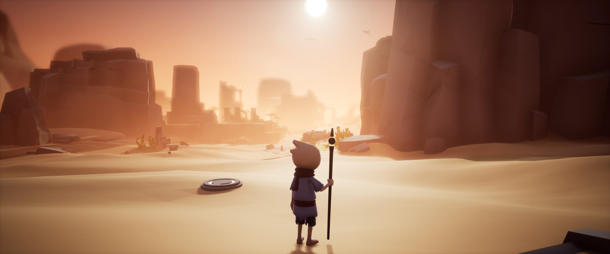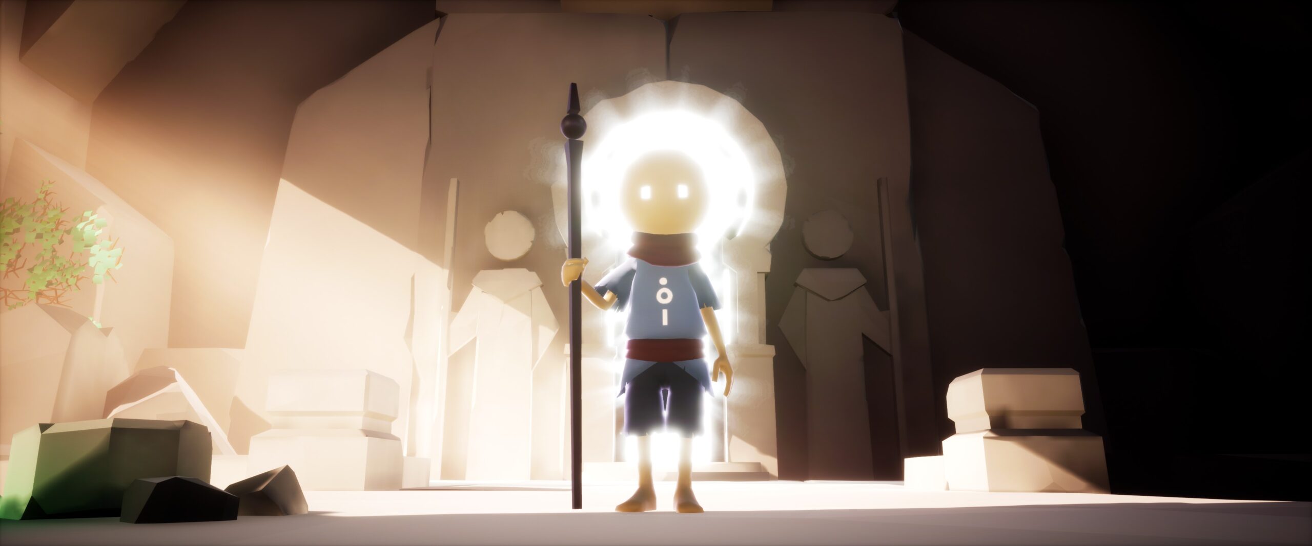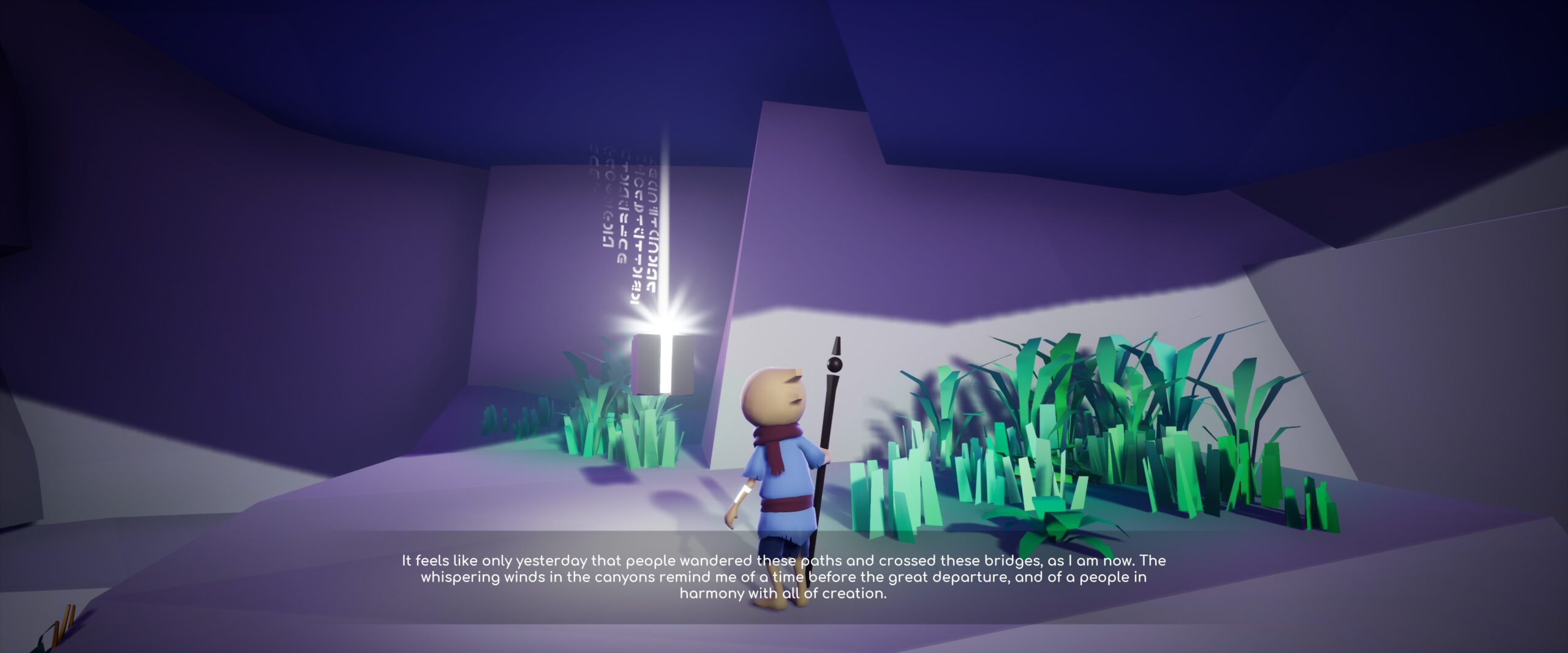 OMNO takes the low-poly/no texture aesthetic to the extreme, barely even budgeting enough polygons for your characters supposedly round head which can quickly turn very boxy in the wrong light conditions. The heavy use of modern lighting techniques does a lot of heavy lifting here, making the wide vistas of the game’s numerous levels seem a lot more filled out than they otherwise would be. There’s absolutely inspiration from the giants of this genre, Journey and its progeny, with the hieroglyphs and various story totems having direct comparisons between the two. Given the Kickstarter page and the current game look basically identical it’s clear that not much effort was spent on upping the visuals, which I can understand, although I really do feel like some places could’ve done with a little love (like old boxhead there).